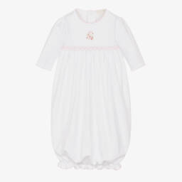 Cosy white day gown and hat set for baby boys and girls by Little Me, made in soft, ribbed cotton jersey. Gentle against delicate skin, the gown has endearing safari animals embroidered on the chest, contrast grey trims and useful fold-over scratch mitts. The hem is gently elasticated and it has an envelope neckline for easy dressing. The gown comes with a matching hat with a cute turned-up brim.