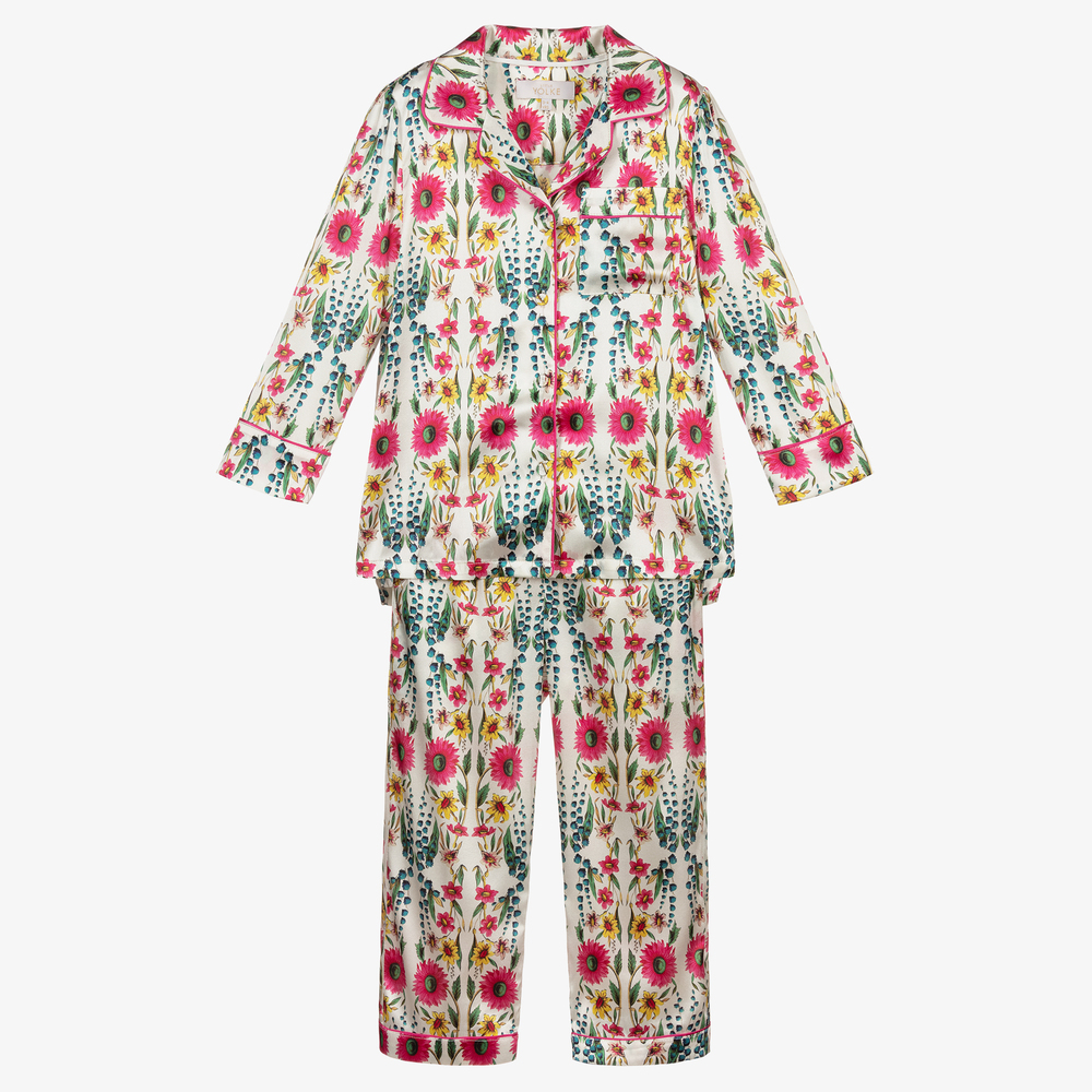 Girls Mini-me luxury ivory pyjamas by LiTTLE YOLKE. Made from soft and lightweight stretch silk, the set has a colourful wildflower print. They have a front pocket and pink piping trims. The top has covered button fastenings on the front and the bottoms have a drawstring waist with pockets on the sides.