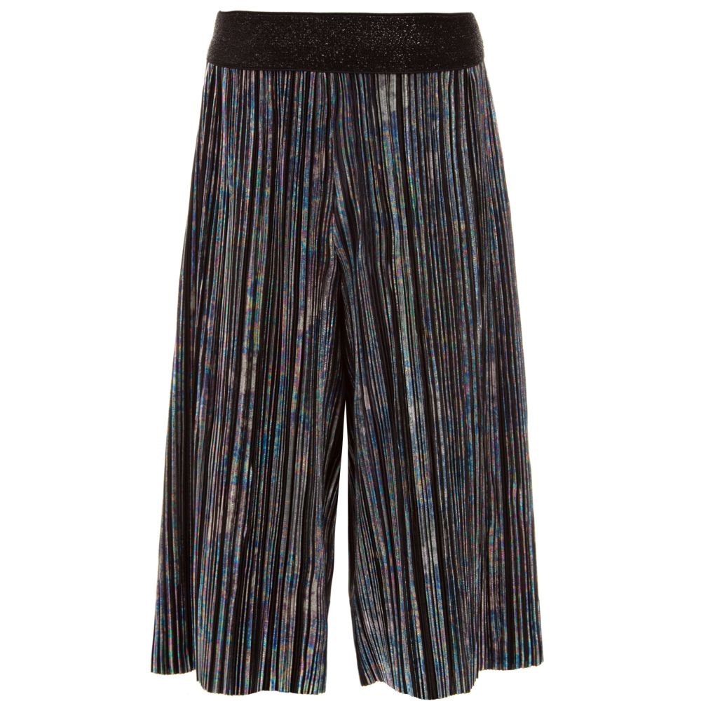 Girls elegant iridescent silver and black pleated chiffon culottes by Loredana. They have wide, flared legs and a sparkly elasticated waistband