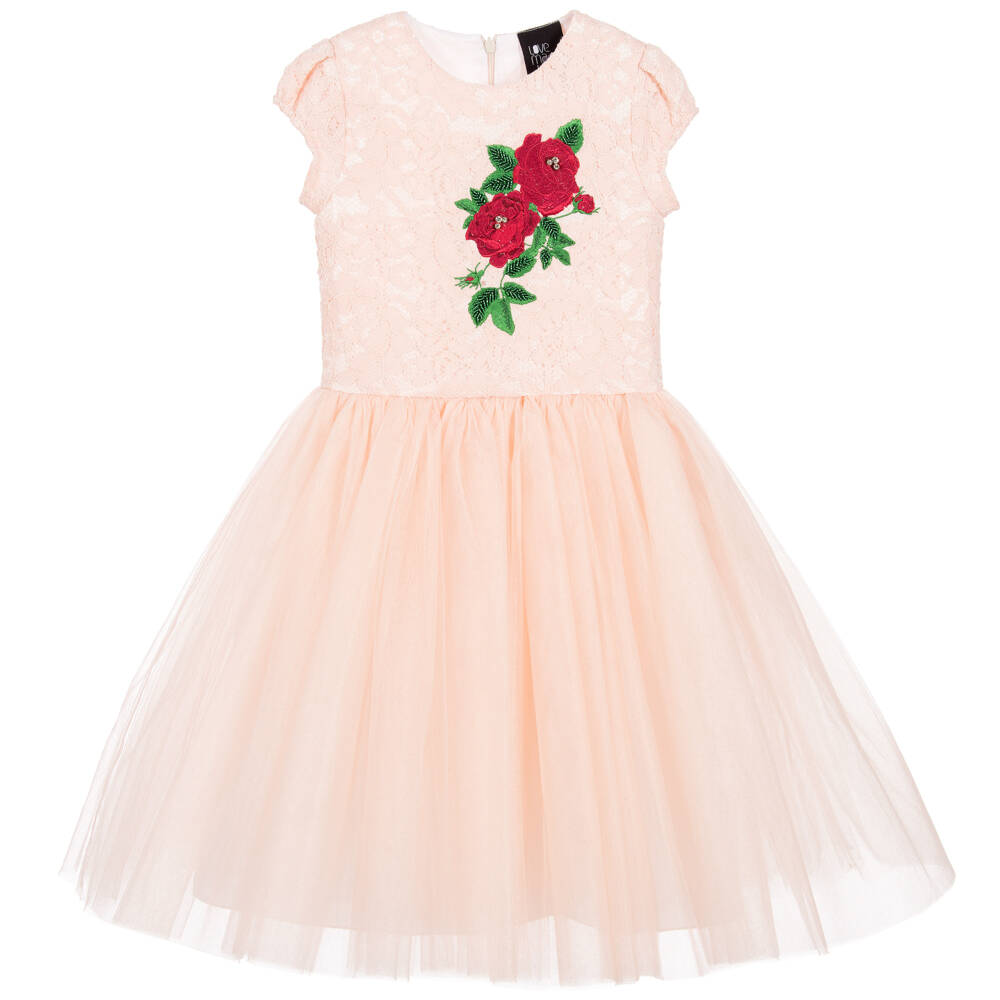 This gorgeous, salmon pink party dress by Love Made Love has a fabulous fifties feel to it, with a full gathered tulle skirt. It has little, capped sleeves and sparkling rose embroidery on the soft lace bodice, and fastens with a discreet zip around the back.