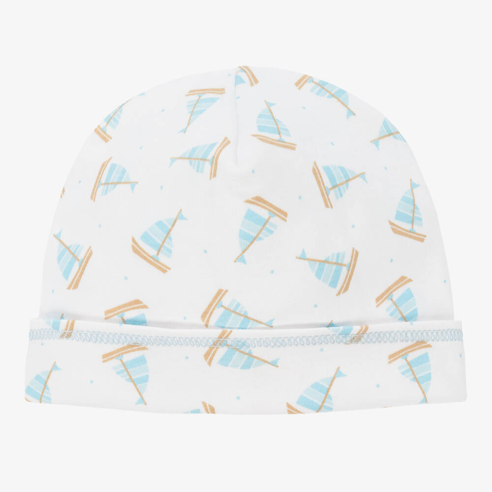 White Pima cotton hat for baby boys from Magnolia Baby. Made in a double layer of super-soft jersey, it has pale blue stitch detailing on the turn-up brim and sweet beige and blue sailboat prints.