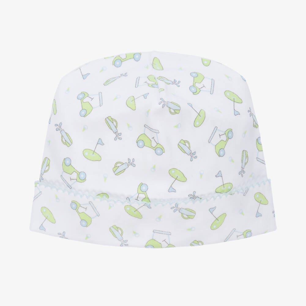 White with a blue and green golf print, this sweet hat for baby boys is by Magnolia Baby. Made in a double layer of Pima cotton jersey, it is super soft and comfortable against delicate skin. There is a turned up brim, trimmed in blue picot embroidery.