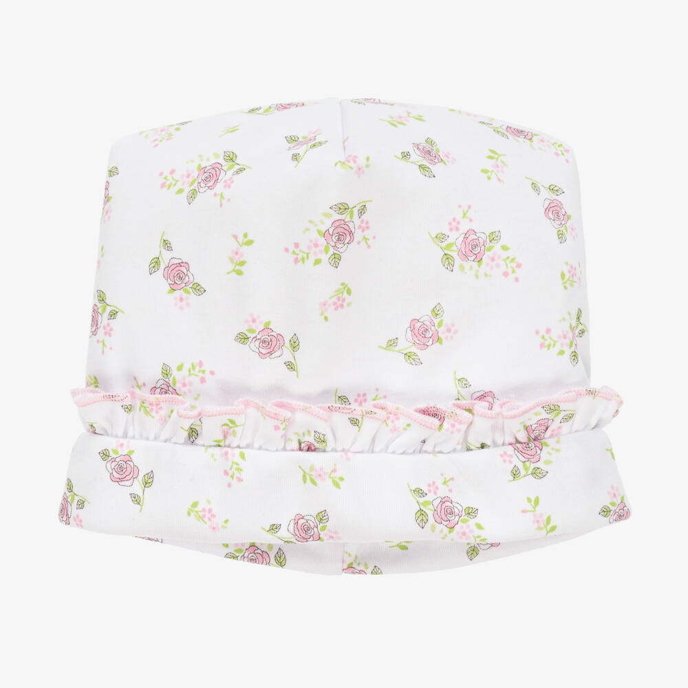Lovely white floral layette hat for baby girls, by Magnolia Baby. Made in soft Pima cotton jersey for comfort, it has a sweet frilled trim around the turned-up brim for a cute, girly look.