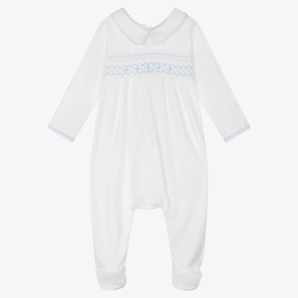 Boys White Cotton Smocked Babygrow