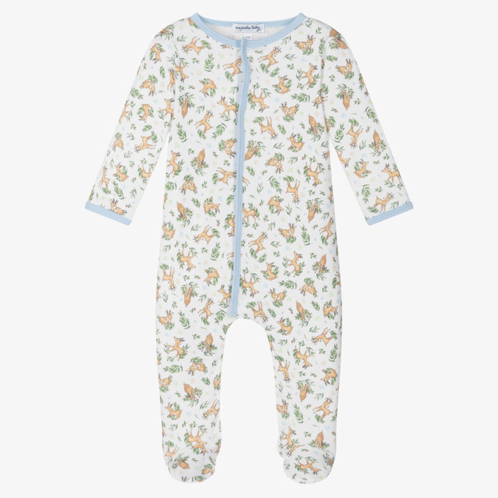 White babygrow for boys by Magnolia Baby, made in super soft and stretchy Pima cotton jersey. It has a cute all-over baby deer print and pale blue trims. It fastens with poppers on the front and between the legs for easy dressing and changing. Smaller sizes have fold-over scratch mitts.