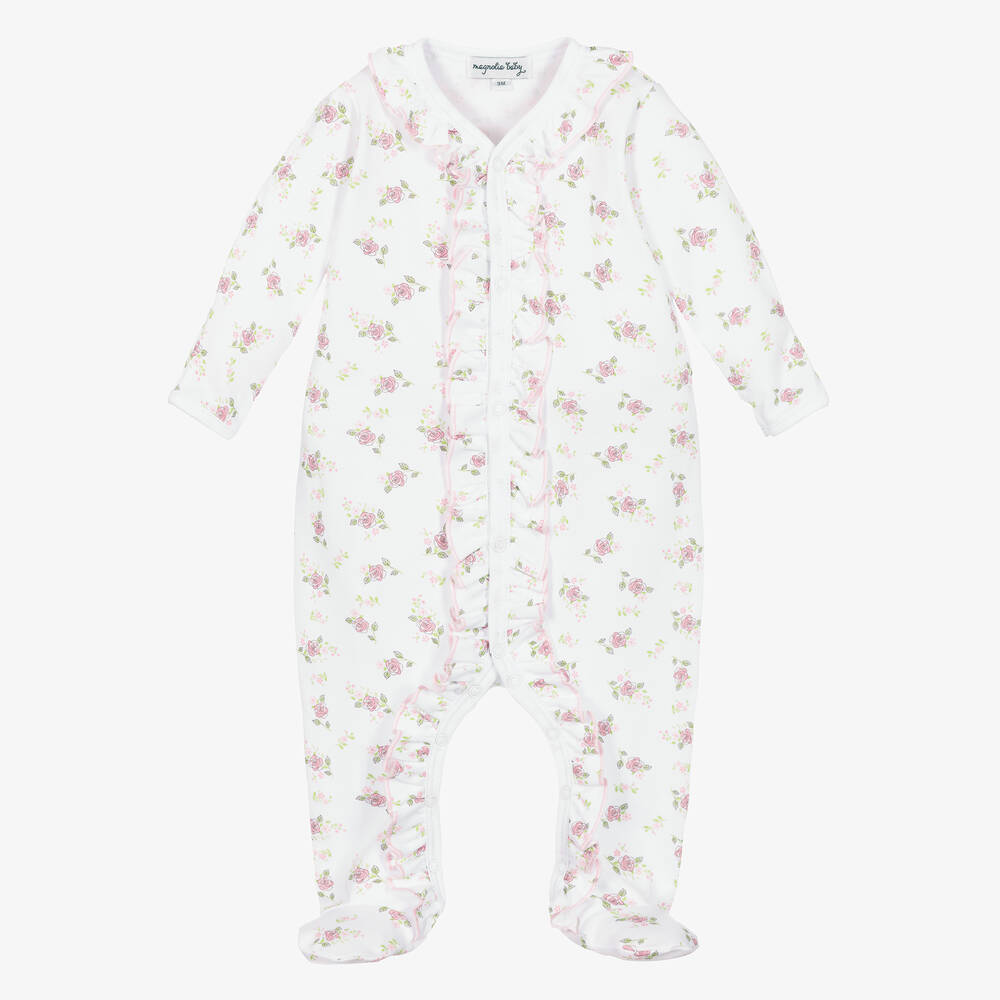 An adorable white babygrow for girls by Magnolia Baby, made in the softest Pima cotton jersey. This babygrow has a sweet pink and green rose pattern with ruffled trims on the front. Poppers fasten at the front for ease, and there are scratch mitts on smaller sizes for warmth.