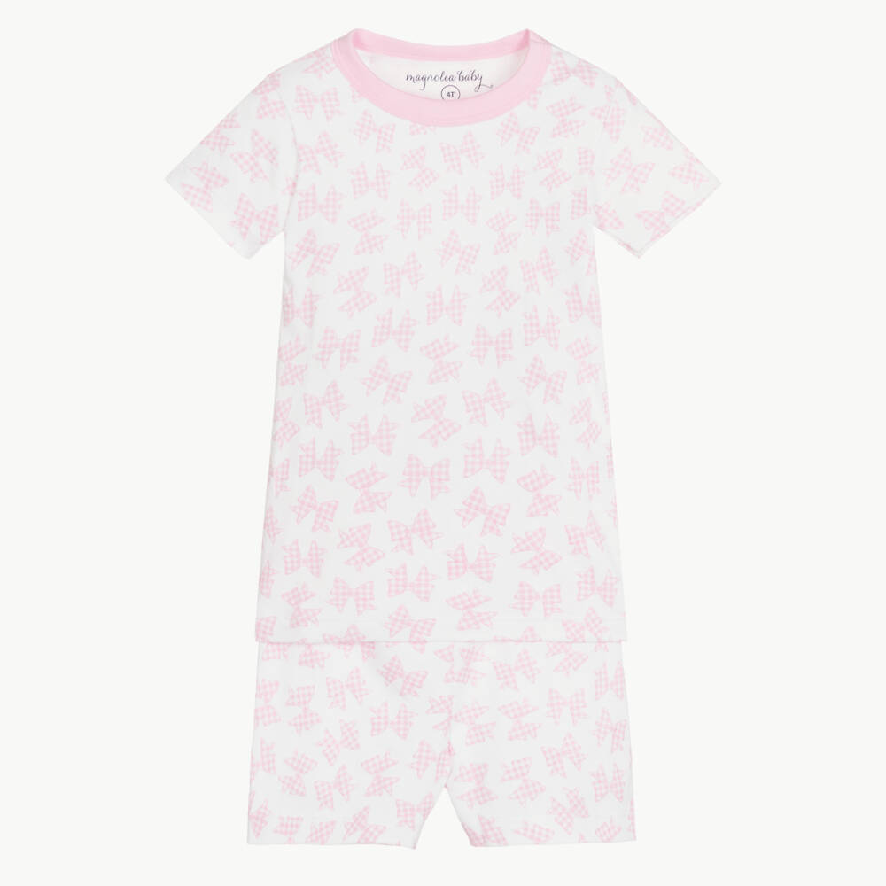 Pink and white jersey pyjamas for girls by Magnolia Baby, made in the softest Pima cotton. Charmingly sweet, these pyjamas are patterned in all-over gingham bows. They are super comfortable for bedtime, in a snug fitting style.