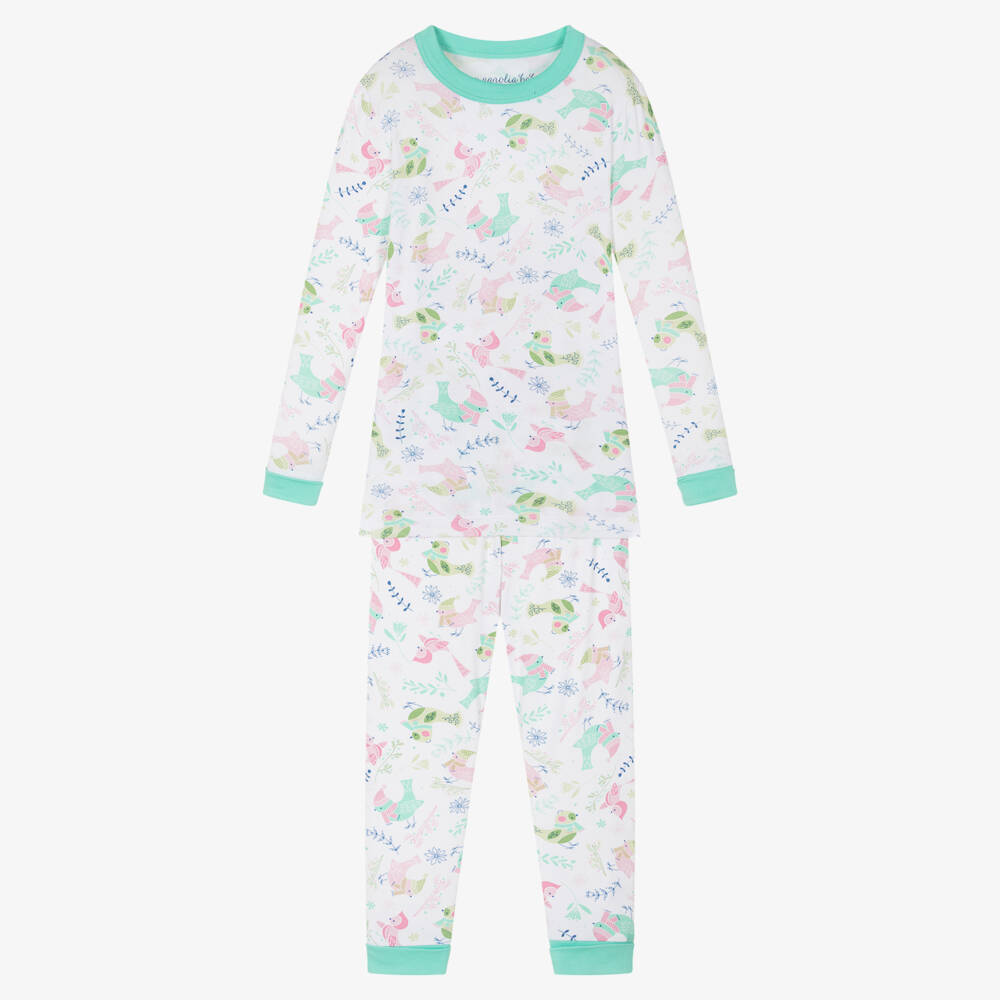 White long pyjamas for girls by Magnolia Baby, made in soft and stretchy bamboo jersey. They have green trims and are patterned with cute birds, wearing hats and scarves in pastel shades of green and pink. The bottoms have an elasticated waist for a comfortable fit.