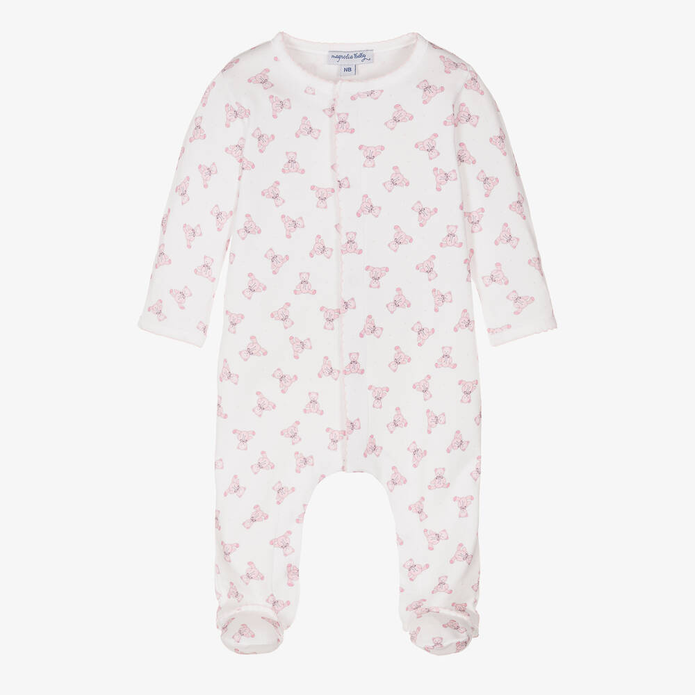 Lovely white and pale pink babygrow for girls, by Magnolia Baby. Made in soft Pima cotton jersey, it has charming pink teddy bears all-over and adorable pink picot trims. It easily fastens with simple poppers on the front and between the legs for simple dressing. Tiny sizes have scratch mitts on the cuffs, preventing little ones from scratching themselves.