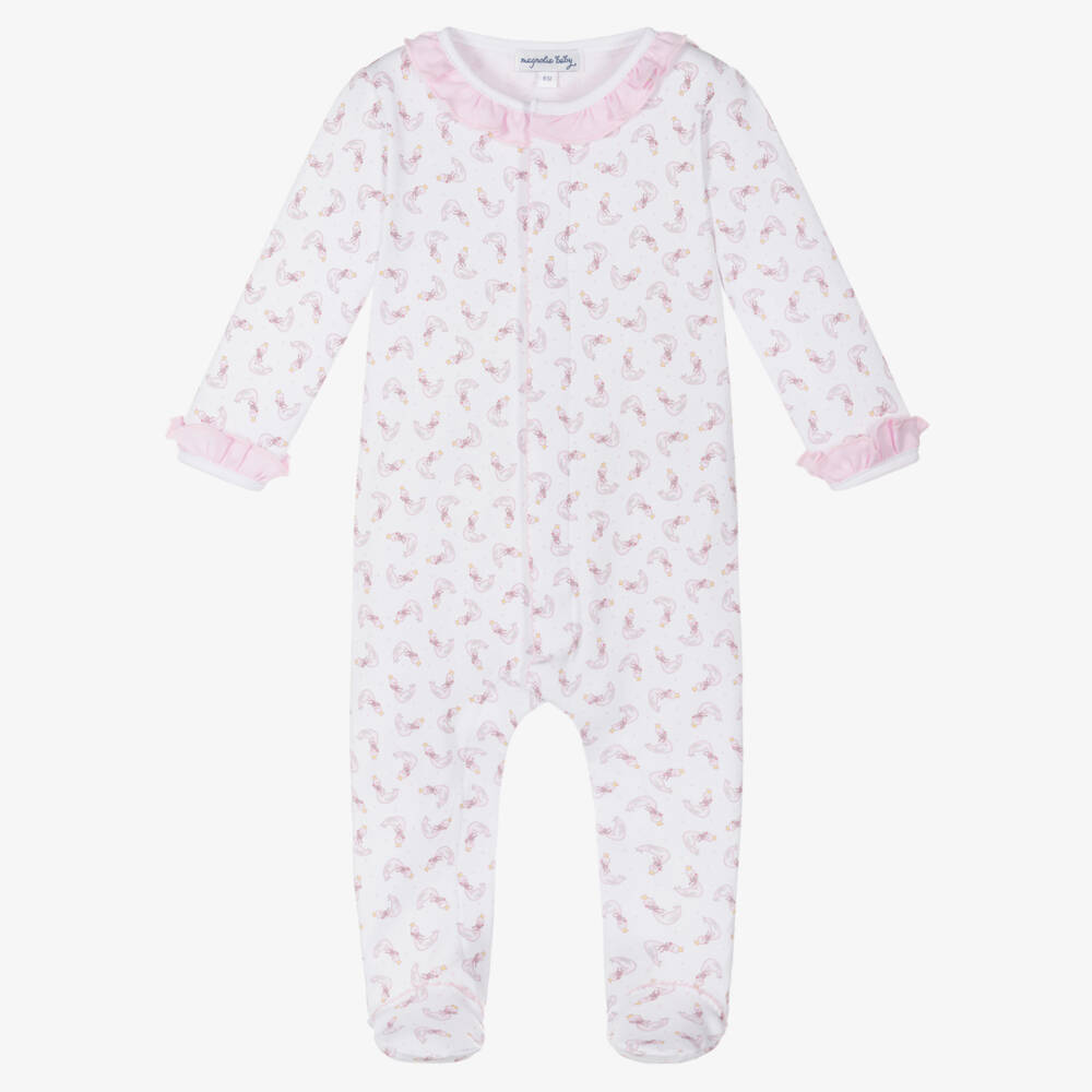 Made from soft pima cotton jersey, this white babygrow for girls is by Magnolia Baby. It has a lovely princess swan pattern and pretty pale pink ruffle trims. There are popper fastenings on the front and between the legs for easy dressing.
