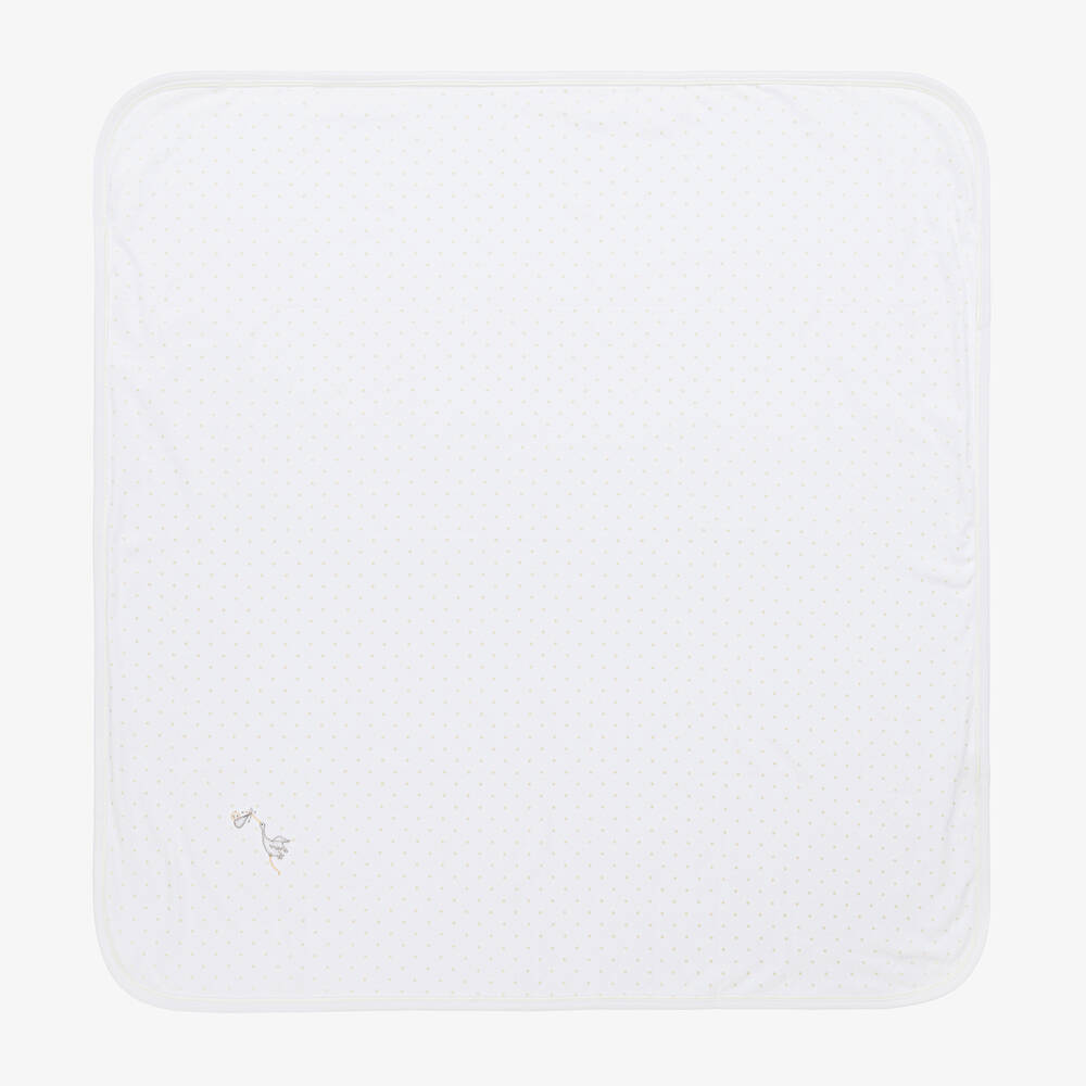 Baby boys and girls ivory and grey blanket by Magnolia Baby. Made in a beautifully soft, Pima cotton, it has the designer's 'Worth the Wait' embroidered stork and baby motif with tiny ivory spots. It is lined with soft ivory Pima cotton and is ideal for using in the cot or when out-and-about as a cover-up