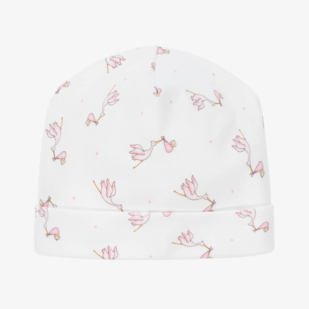 Baby girls white super soft Pima cotton hat by Magnolia Baby. Made with a double layer of jersey, it has a pink stork print with a turned up brim.