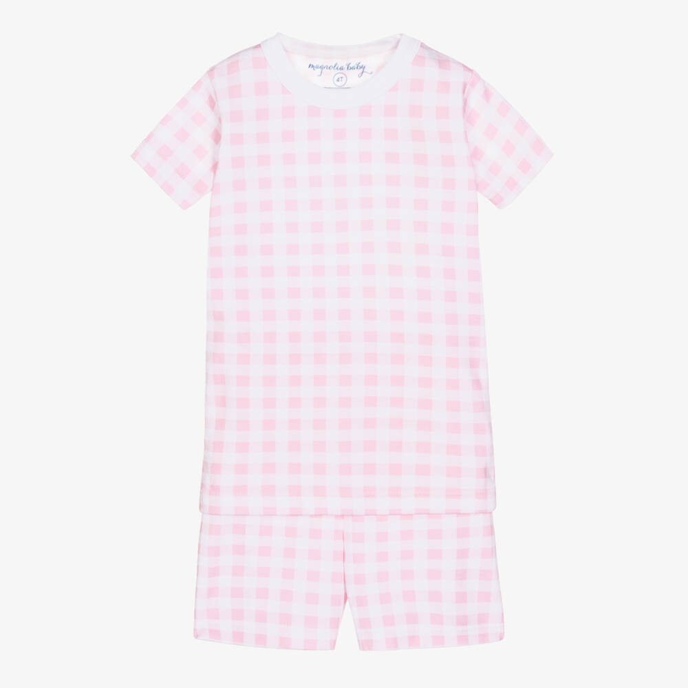 Pale pink and white short pyjamas for girls in traditional gingham by Magnolia Baby, made in super soft and comfortable Pima cotton jersey. They are snug fitting and have a gently elasticated waist on the shorts, just right for little tummies.