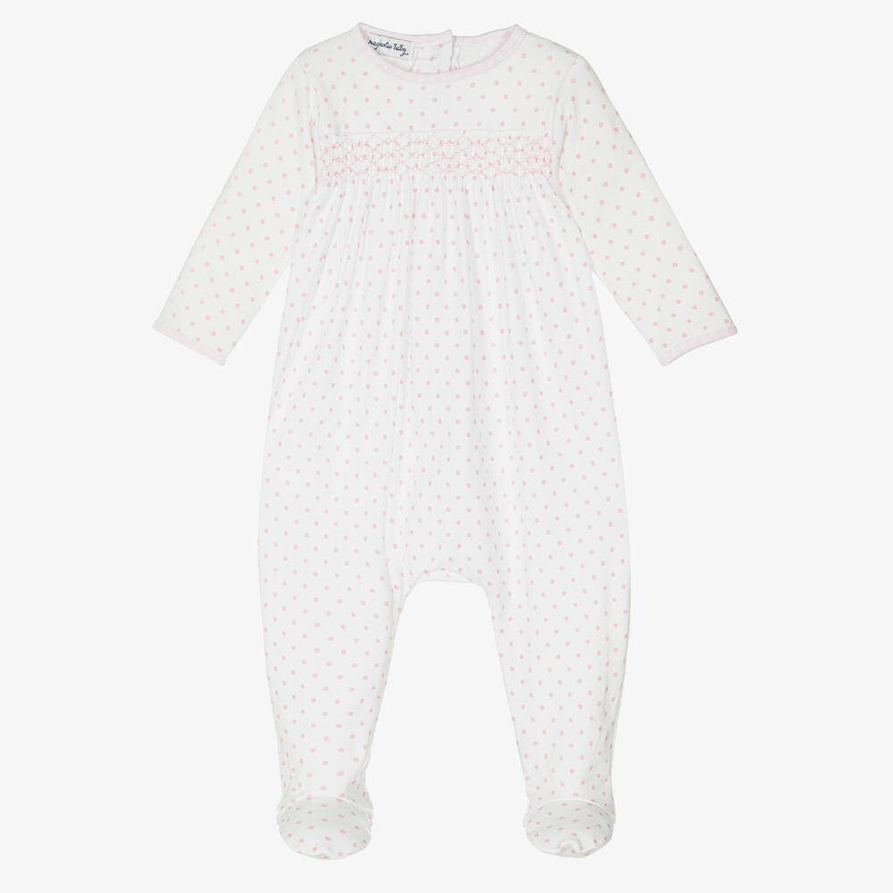 Magnolia Baby white babygrow for girls, made from a super soft Pima cotton jersey. It has a pale pink polka dot print and gingham trim, with a hand-smocked detail on the front.