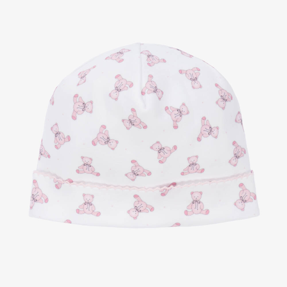 Sweet white hat for baby girls by Magnolia Baby, made in super soft Pima cotton jersey. Cool and comfortable, it has a cute pink teddy bear pattern and a turned up brim with contrast pink stitching.