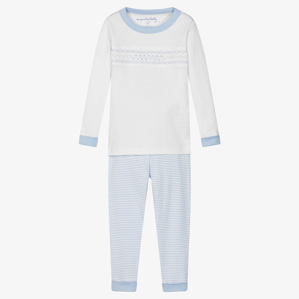 Sweet white and pale blue pyjamas for boys and girls from Magnolia Baby. They are made in super soft and stretchy Pima cotton jersey, with blue cuffs for a comfortable and cosy fit. The white top has a wonderful smocked panel with delicate embroidery across the front. The striped bottoms have an elasticated waist, gentle on little tummies. These comfortable long pyjamas are designed to fit snugly.