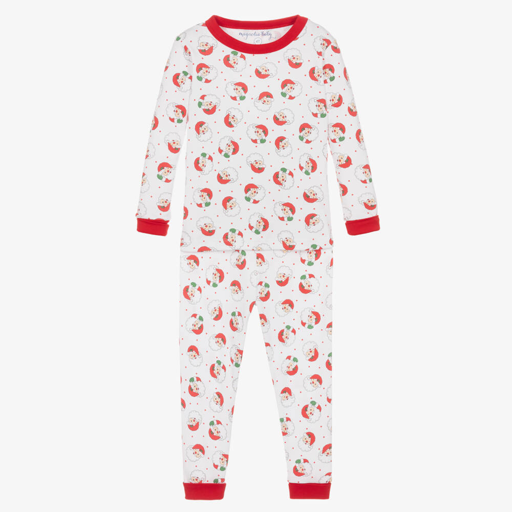 Inspired by the festive season, these white pyjamas for boys and girls by Magnolia Baby are made from soft Pima cotton jersey. They have a charming winking Santa Claus pattern in red, white and green, and bright red trims. Lightweight and stretchy, the bottoms have an elasticated waist for a comfortable night's sleep.