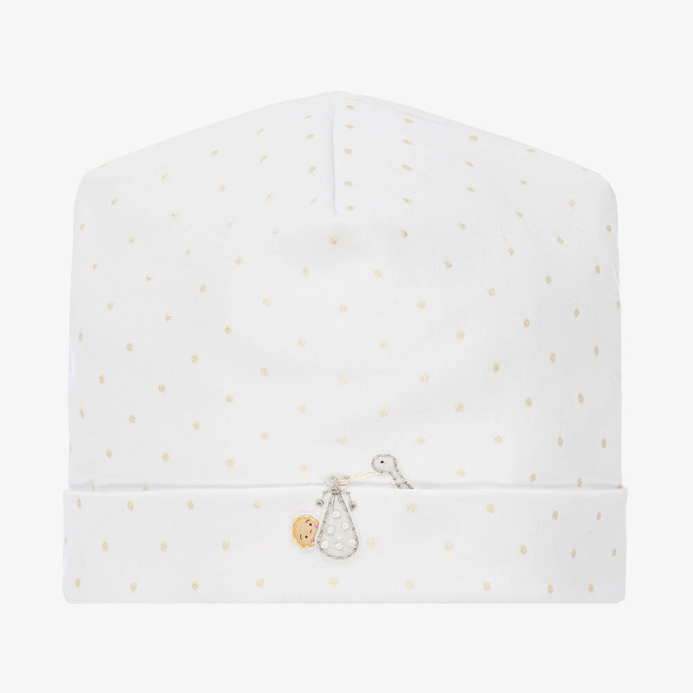 Baby girls and boys white super soft Pima cotton hat by Magnolia Baby. Made with a double layer of jersey, it has an ivory dotty print and a cute stork applique on the front.