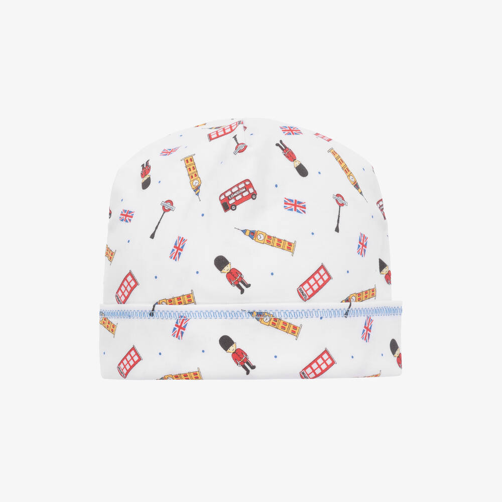 Lovely white hat for baby boys and girls from Magnolia Baby. Made in a double layer of soft Pima cotton jersey, it has an iconic London-themed print and a turned-up brim.
