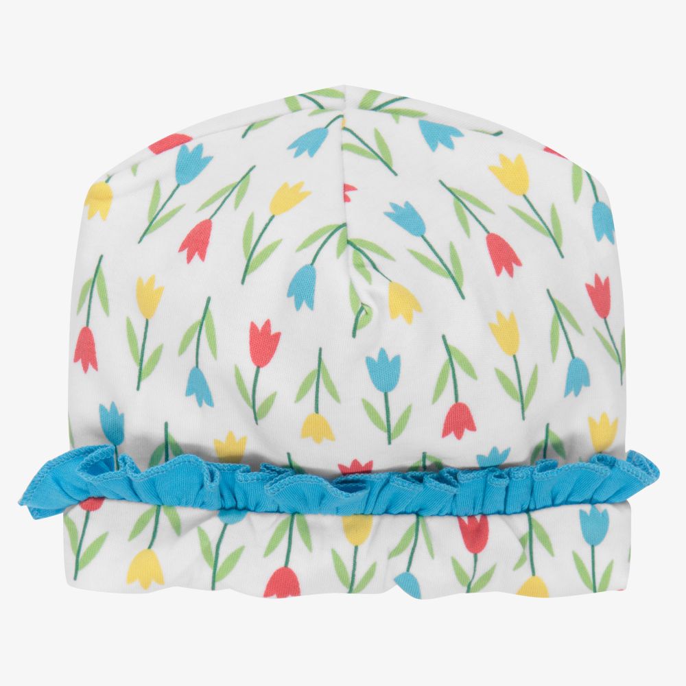 White double layer hat for baby girls by Magnolia Baby, made in soft Pima cotton jersey. It has a colourful floral pattern and a blue frill on the turned up brim.
