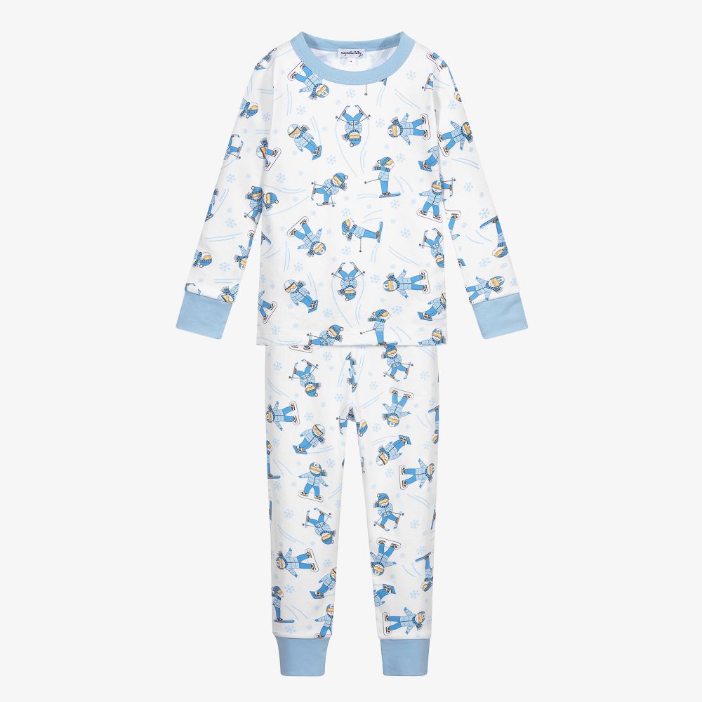 White long pyjamas for boys by Magnolia Baby, made in super soft and stretchy Pima cotton jersey. They have a blue skier print and pale blue trims.