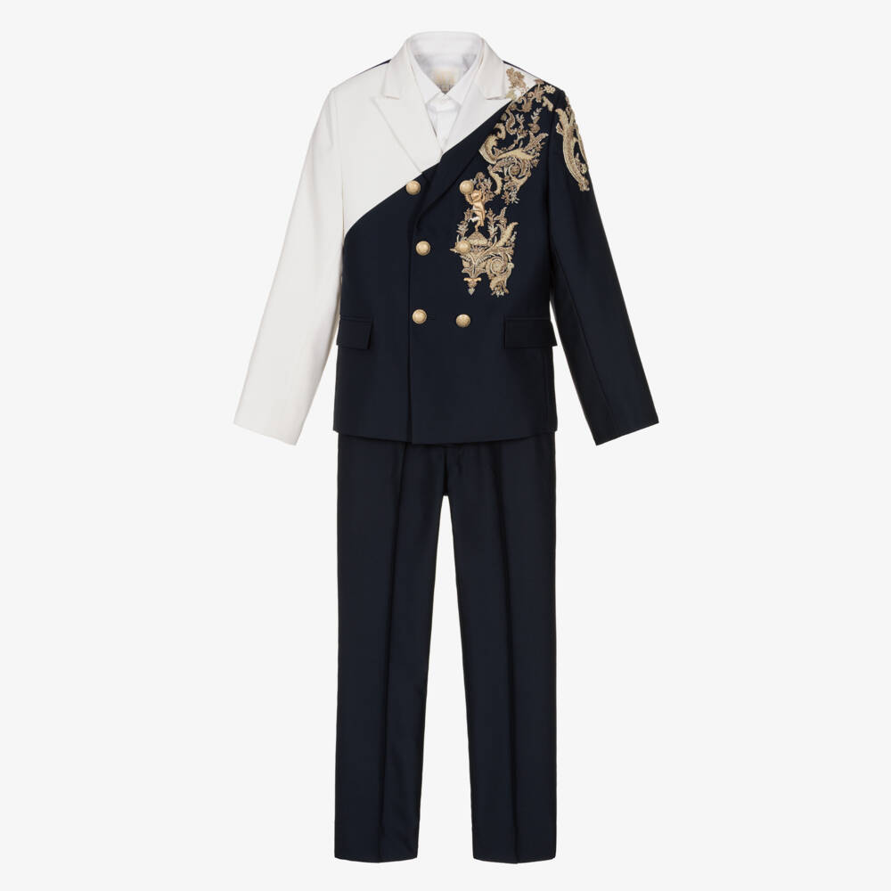 A contrasting navy blue and ivory suit for boys by luxury couture brand Maison Ava. Made in a beautifully soft wool blend, the double-breasted blazer jacket is meticulously detailed with hand embroidery over one shoulder. The victorian-inspired design is further accentuated with fine beading in two tones of metallic gold and carefully coordinated with embossed, gold buttons. Other signature details include notched lapels, a silky soft lining and front flap pockets. The tailored navy blue trousers have useful pockets, an adjustable waist, and a button, zip and hook fastening on the front. The white cotton shirt is classically styled with a collar and button front, perfectly complementing this original ensemble.