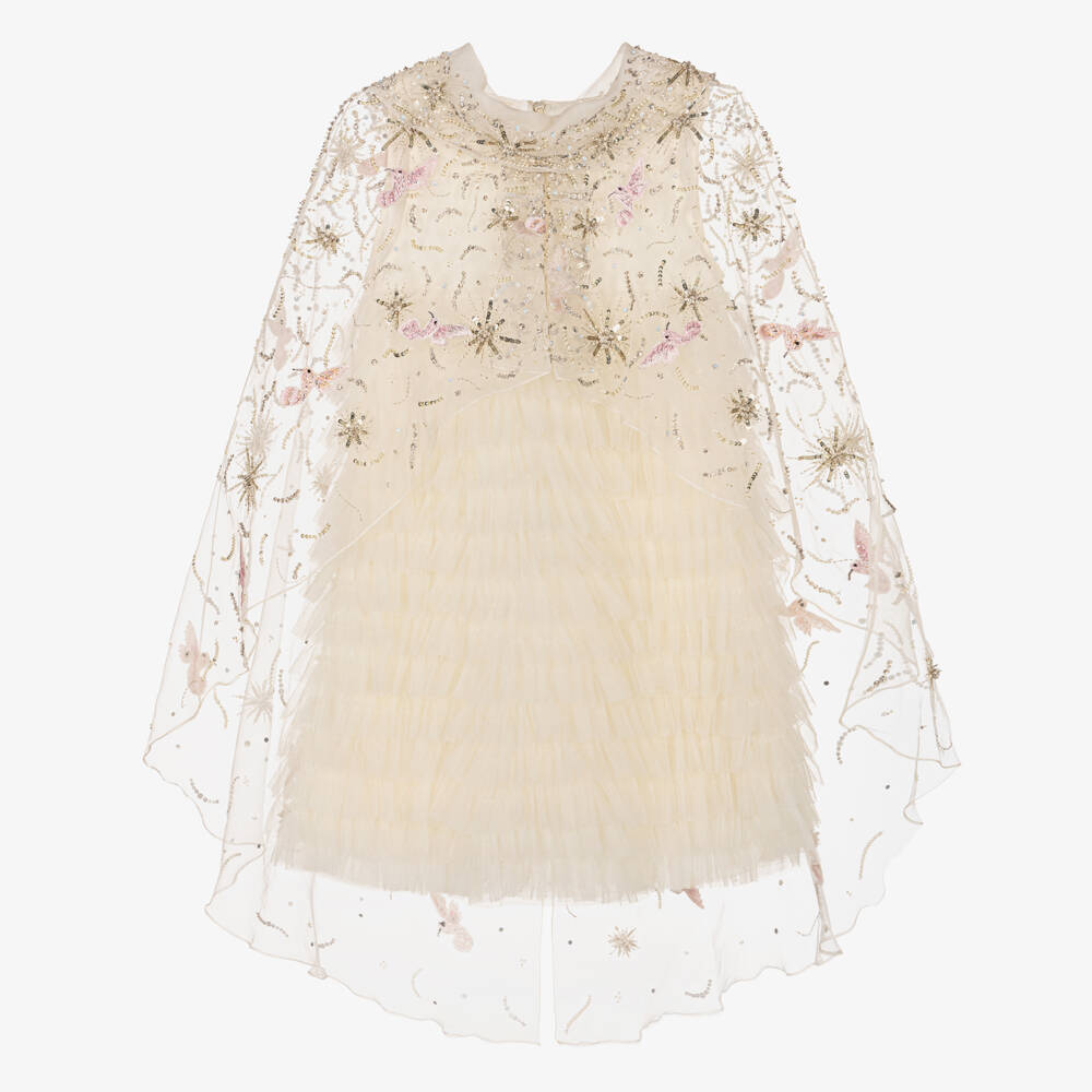A striking ivory cape dress for girls by luxury brand Maison Ava. Fully lined in viscose satin, this handmade dress features a concealed, sheer bodice and layers of gathered tulle ruffles. In a sophisticated A-line shape, the dress is complete with an attached cape, designed with a high neckline and cascading embellishments. The constellation-inspired embroidery sparkles beautifully with a mix of beading, crystals and sequins, while the hummingbirds add a romantic, light pink hue.