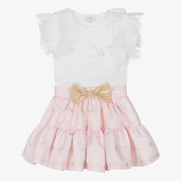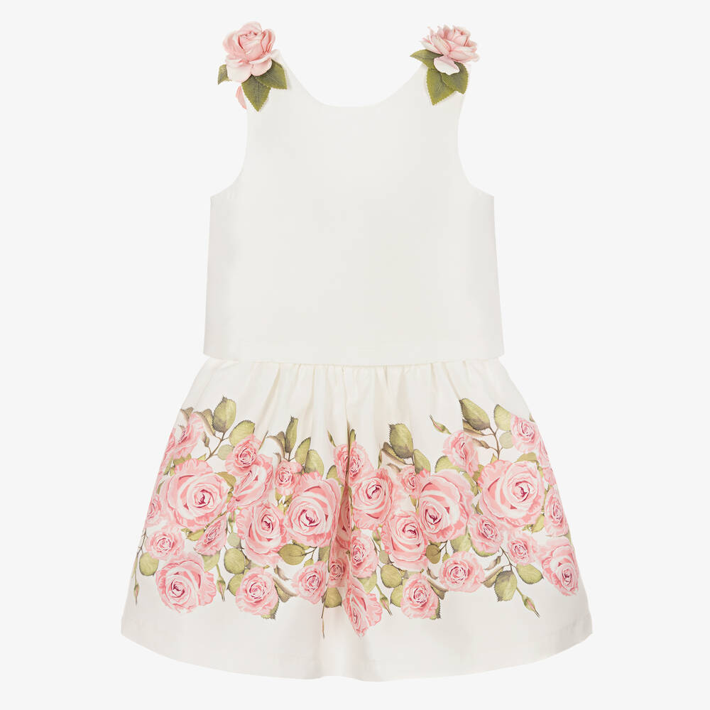 Beautiful ivory special occasion skirt set for girls by American brand Mama Luma, handmade in sumptuous, mid-weight satin. The satin twill top is embellished with pink rose appliqués around the back of the shoulder straps, whilst the full, gathered skirt is patterned with a band of pink and green roses and has a stiffened tulle underlay for extra volume. Both pieces are fully lined for comfort and fasten with a neat, concealed zip.