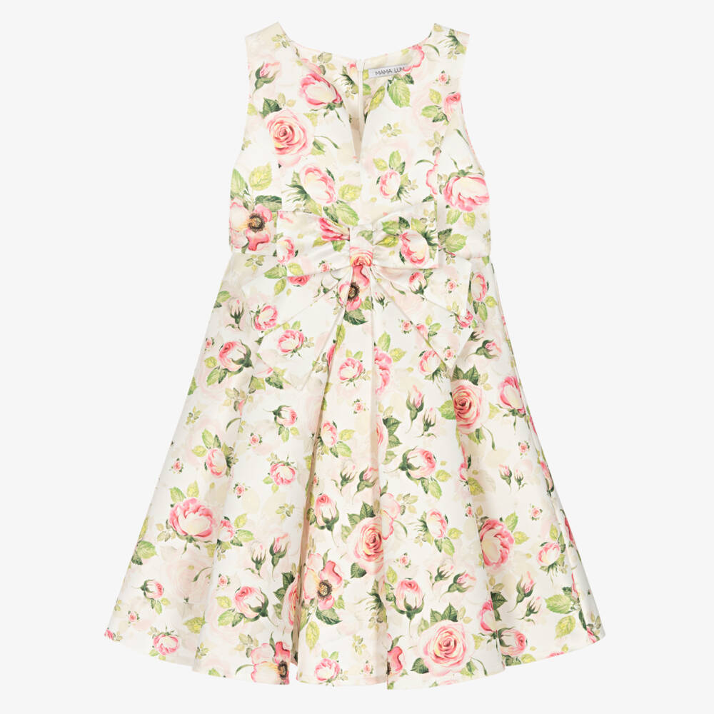 Gorgeous ivory special occasion dress for girls by American brand Mama Luma, with a pink and green rose pattern. Handmade in sumptuous, mid-weight satin, it has a V-neck with a large, fixed bow on the front. The full, box-pleated skirt has layers of stiffened tulle below for fabulous volume. The dress is fully lined for comfort and fastens with a neat, concealed zip around the back.