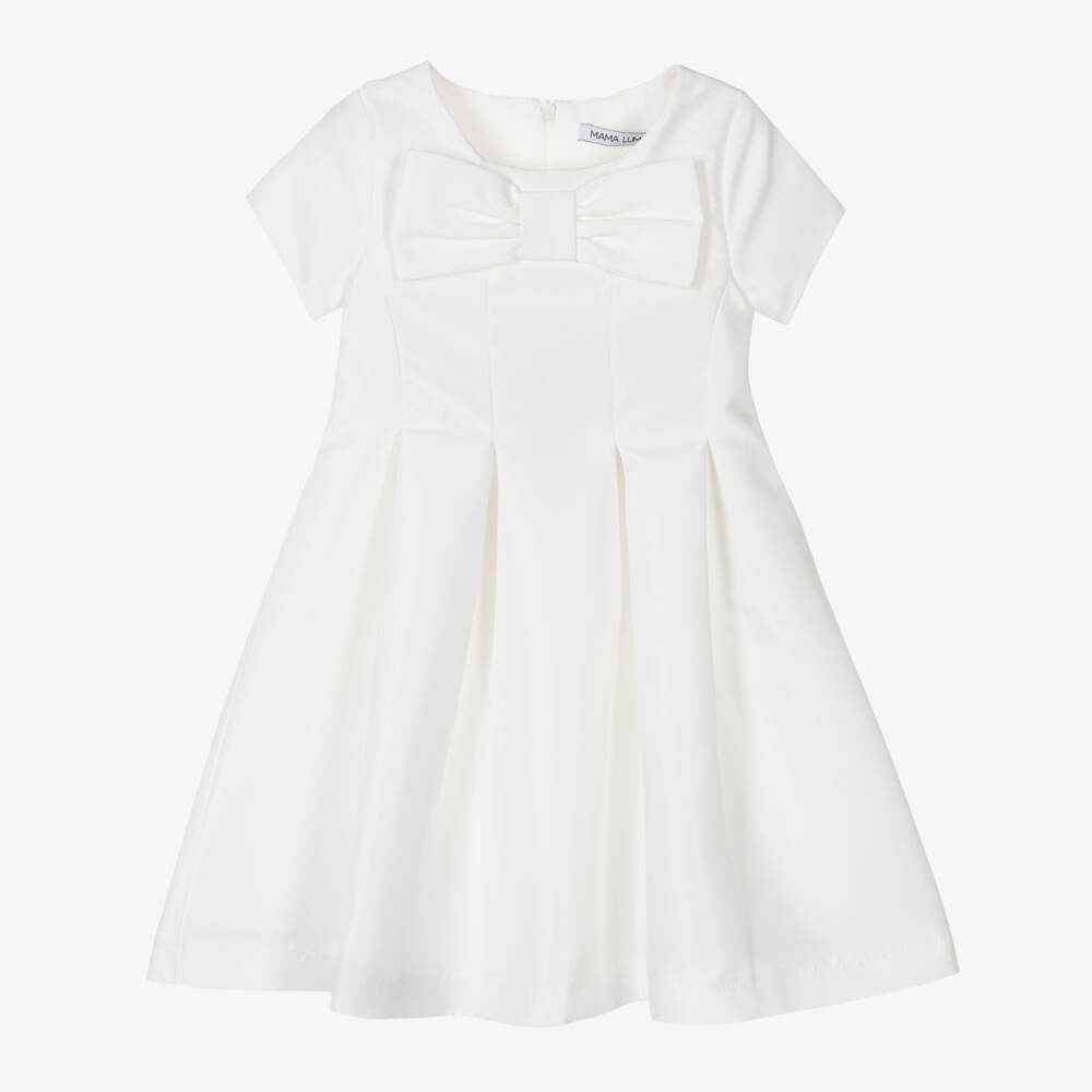 Exclusive to Childrensalon, this beautiful ivory special occasion dress for girls by Mama Luma, is handmade in luxurious satin. This stylish dress has capped sleeves, a large fixed bow on the front and a full box-pleated skirt. Fully lined for comfort in lightweight voile, it fastens neatly around the back with a concealed zip.