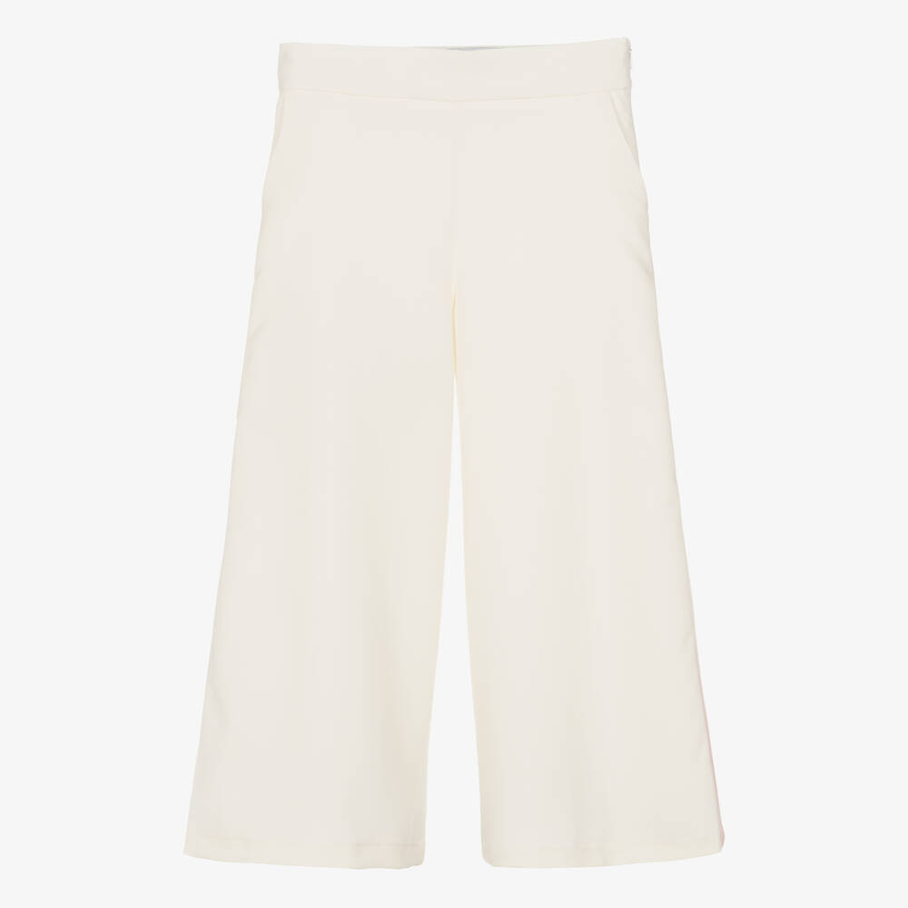 Wide leg trousers for girls by American brand Mama Luma, hand-crafted in a soft ivory colourway. These stylish trousers are made in beautifully soft crêpe with added stretch for a lovely drape. They have a fully adjustable waistband, a discreet side zip and slanted front pockets. Light pink trims on each leg add a touch of colour.