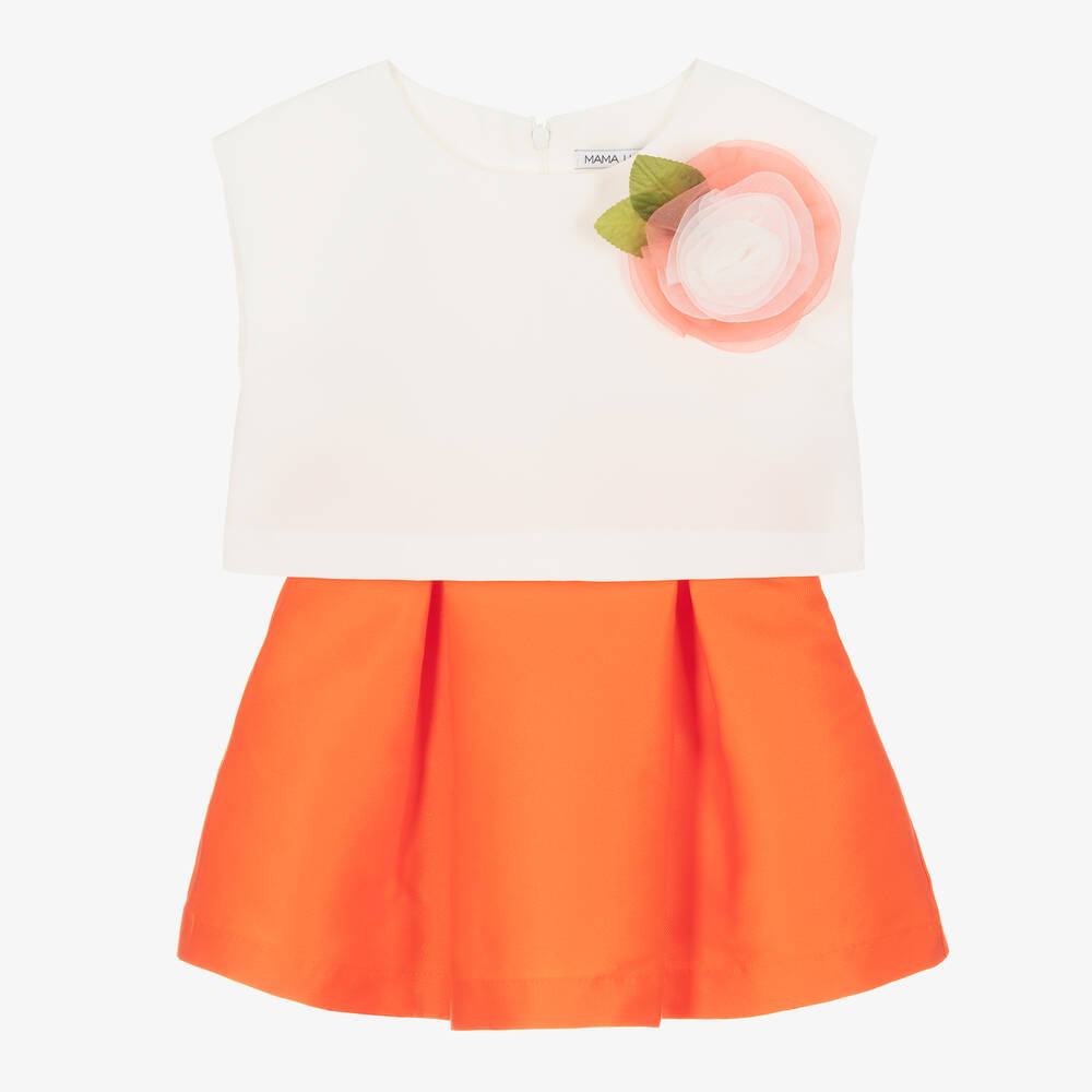 A stunning ivory and orange skirt set for girls, by Mama Luma. Made in a soft woven fabric with a subtle sheen, the cropped sleeveless blouse has an organza flower appliquéd to the chest. To beautifully complement the top, the flared skater-style skirt has an adjustable waistband for a lovely fit. Both items have a soft voile lining and a useful zip fastening.