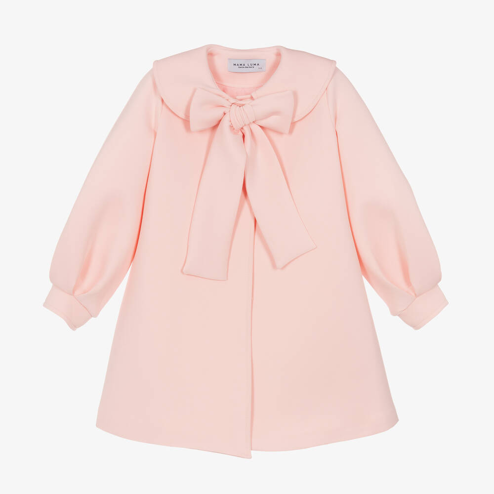 Sweet and pretty, this pink coat for girls is by Mama Luma. Made from soft neoprene jersey with a lightweight woven lining, it has a statement rounded collar and box-pleated detailing on the long sleeves. It fastens with a single popper on the neckline, concealed by an appliqué bow for a delightful finish.