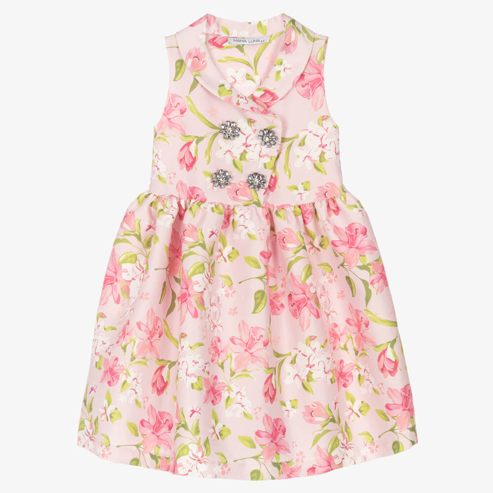 Eye-catching pink 50's style special occasion dress for girls by American brand Mama Luma. Handmade in sumptuous, lightweight satin, it has a beautiful contrasting pink and white floral print, a wide collar and a full, gathered skirt. There are decorative, sparkling crystal buttons on the bodice, placed over popper fastenings. The dress also has a side zip fastening.