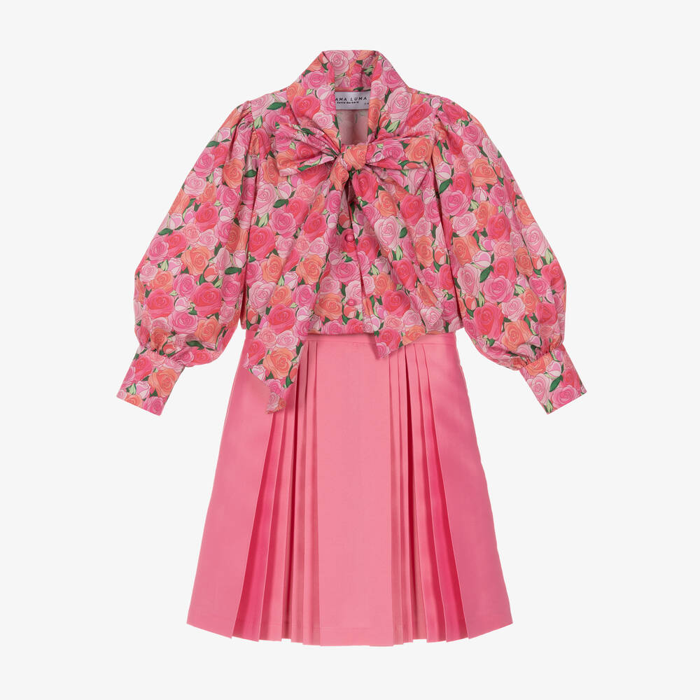 A gorgeous bright pink skirt set for girls by Mama Luma. The silky blouse has an eye-catching rose pattern, with puffed long sleeves and fitted cuffs. Fastening with buttons on the front, it has a high neckline with long ties that can be secured into a pretty bow. Made from a soft satin twill with a lightweight lining, the skirt has a charming pleated design on both sides. Discreetly fastened with a concealed zip on one side, it has an adjustable waist for a comfortable fit.