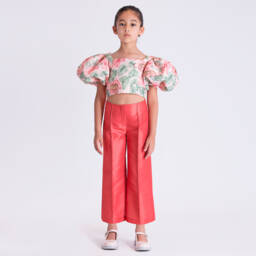 Exclusive to Childrensalon, a pair of pink satin twill trousers for girls by Mama Luma. Ideal for a special occasion, they are beautifully trimmed with feathers around the ankles. They fasten with a front zip and have an adjustable waist for comfort.