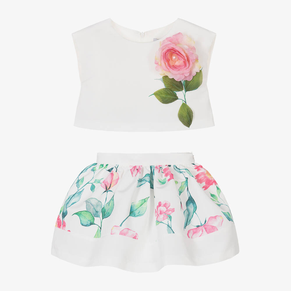 Girls White Floral Satin Skirt Set