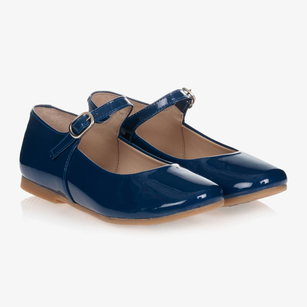 Manuela de Juan smart blue patent leather pumps for girls. Beautifully handmade, these traditional style Mary Jane shoes have a soft leather lining, an adjustable buckle fastening and a rubber sole.