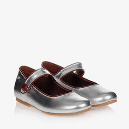 Girls metallic silver ballerina pumps with brown trims by Manuela de Juan, handmade in soft leather. In a pretty Mary Jane style, they have a soft leather lining, popper fastening and a rubber sole.