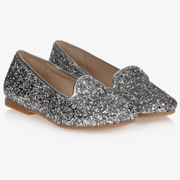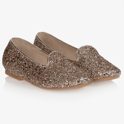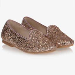 Girls sparkly rose gold glitter covered leather slip-on shoes by Manuela de Juan. Handmade in Spain, these smart shoes have a smooth leather trim, soft leather lining and a rubber sole.