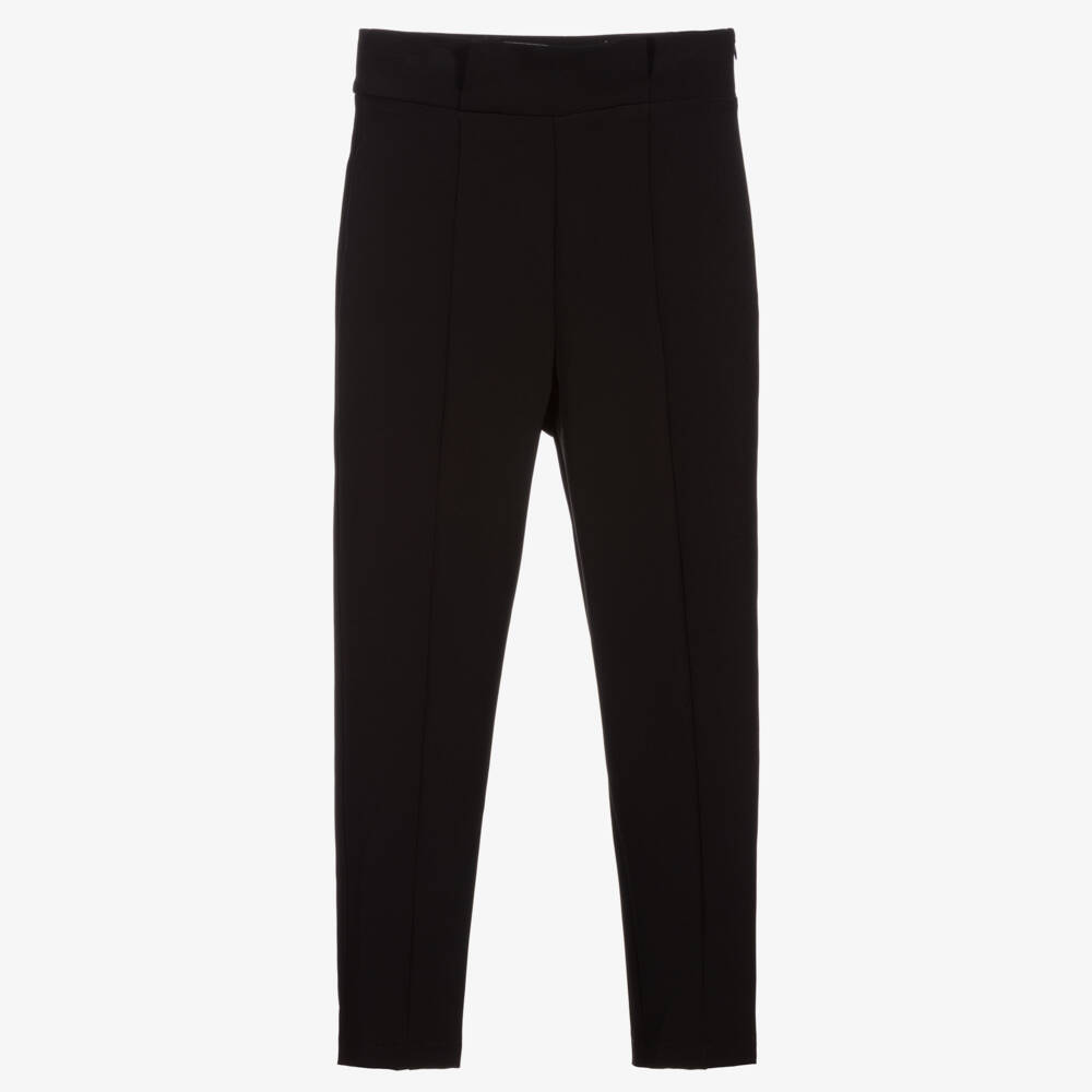 Girls black high-waisted trousers by Marc Ellis. Smartly tailored, with tapered legs, they are made in soft and stretchy crepe jersey, with a pleated waistband and side zip fastening.
