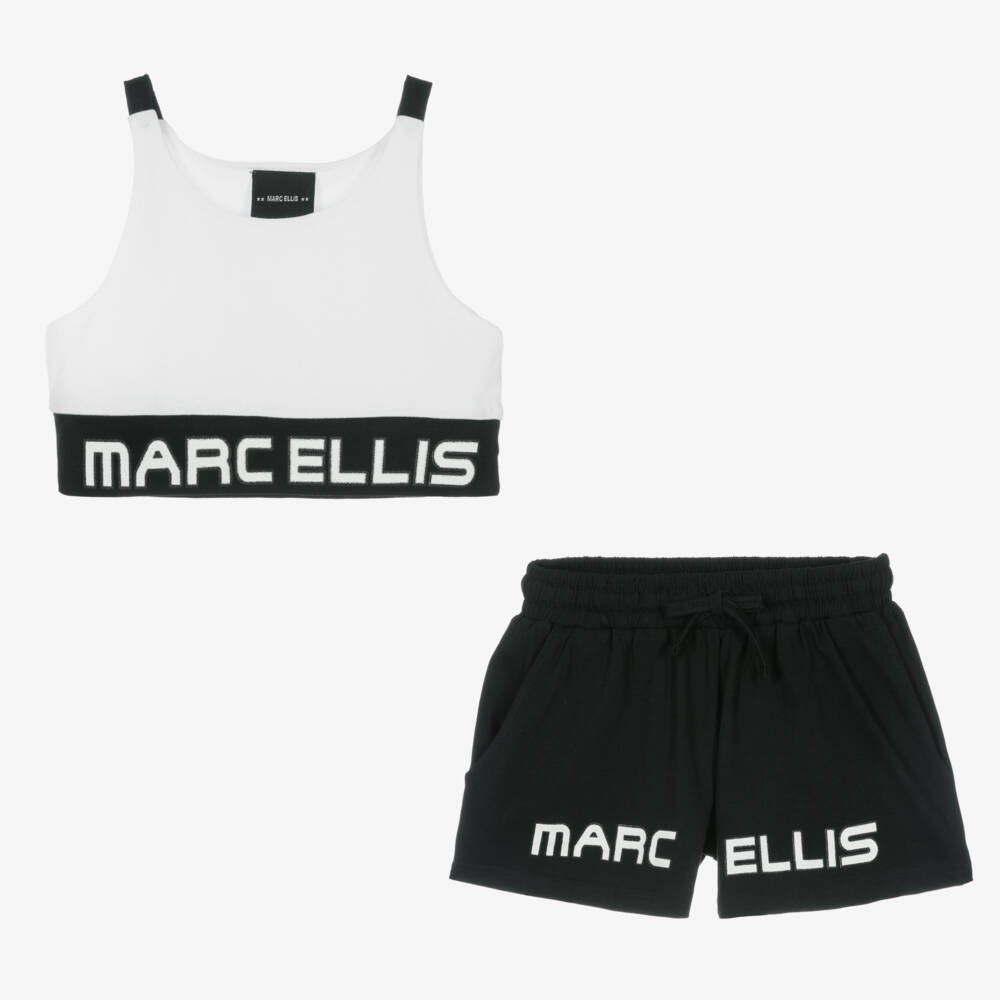 Cool white and black cotton shorts set for girls by Marc Ellis. Both pieces are made in soft, stretchy and lightweight jersey for lasting comfort. The cropped top has statement black trims on the shoulders and hem and a white and black glitter logo print on the front. The stylish high-rise shorts have an elasticated waist with a drawstring for a great fit, handy front pockets and matching branding across the hem.