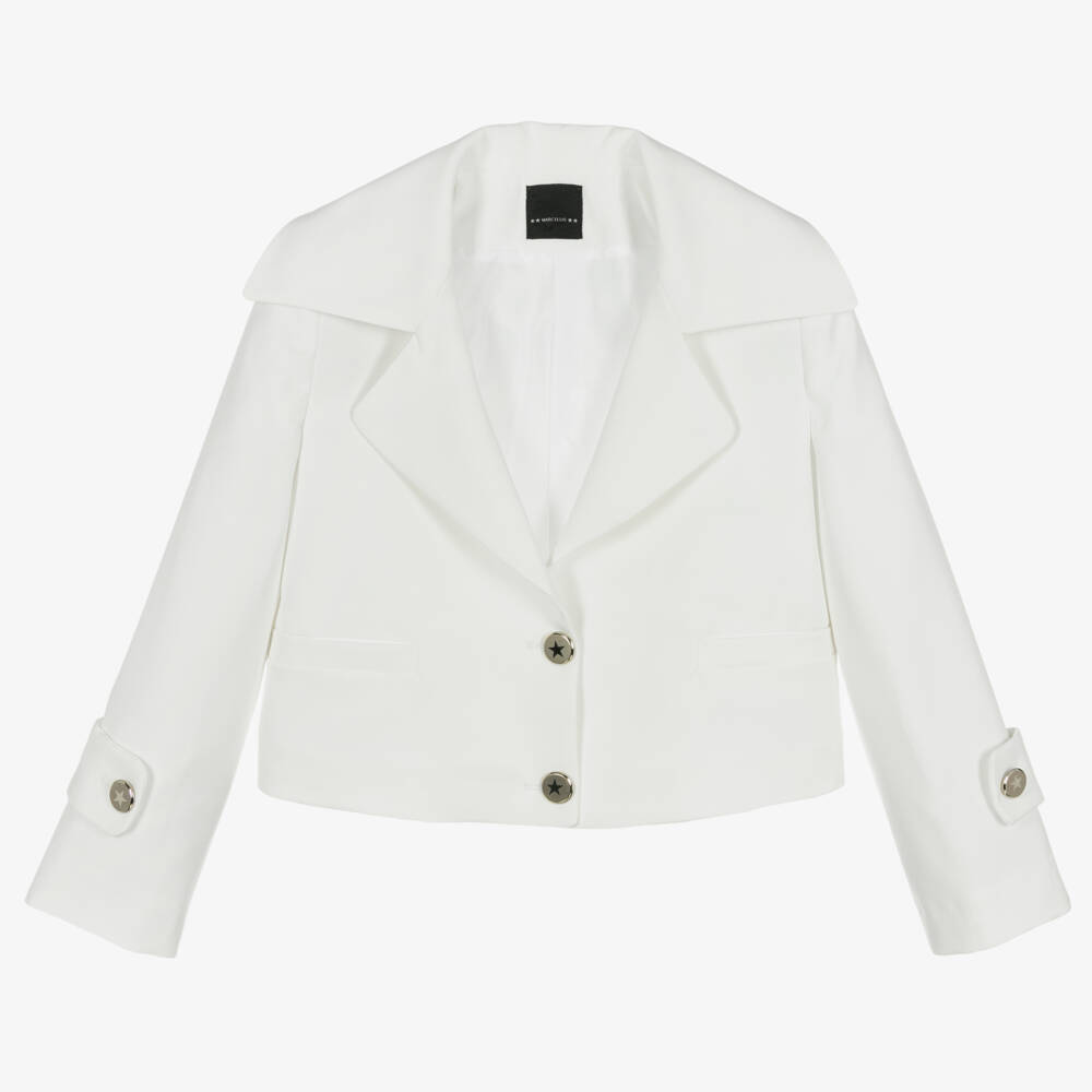 White cropped blazer for girls from American designer Marc Ellis, woven in soft crêpe with slight stretch. In a boxy fit, this oversized jacket has large, dramatic lapels and statement silver buttons with logo and star motifs in the centre. A comfortable silky-soft lining and front pockets finish this cool piece.