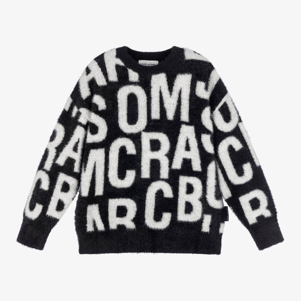 Soft and fluffy, black knitted sweater for boys and girls by MARC JACOBS. It is patterned in the designer's white jumbled logo for a statement look. This cosy jumper has ribbed trims and long sleeves, with a branded tab at the side seam.