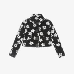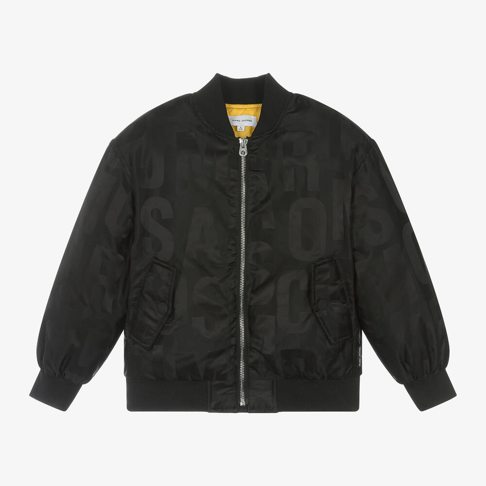 Stylish black satin bomber jacket for boys and girls by MARC JACOBS, as seen in the main collection. Made with recycled materials, it is woven with the American brand's jumbled logo in a tonal pattern for instant designer appeal. It is padded for warmth, with a bold yellow satin lining and has a zip fastening with a branded pull. Completing the designer look, it has soft ribbed trim on the collar, cuffs and hem and practical popper-fastening pockets with a cosy fleece lining. A woven logo tab on the side seam adds a signature finishing touch.
