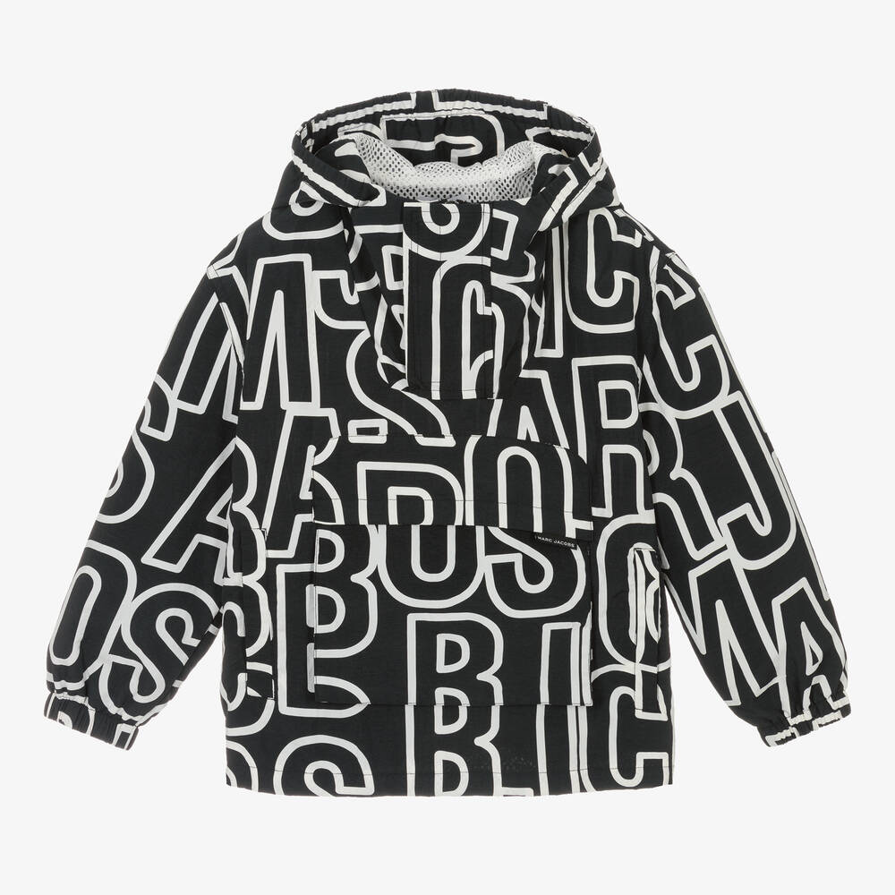 Black hooded windbreaker jacket for boys by MARC JACOBS, with the American brand's white jumbled logo print for instant designer appeal. Silky and lightweight, with a white mesh lining, it has a half-zip fastening and branded placket at the neck. A pouch and concealed front pockets add a practical finish.