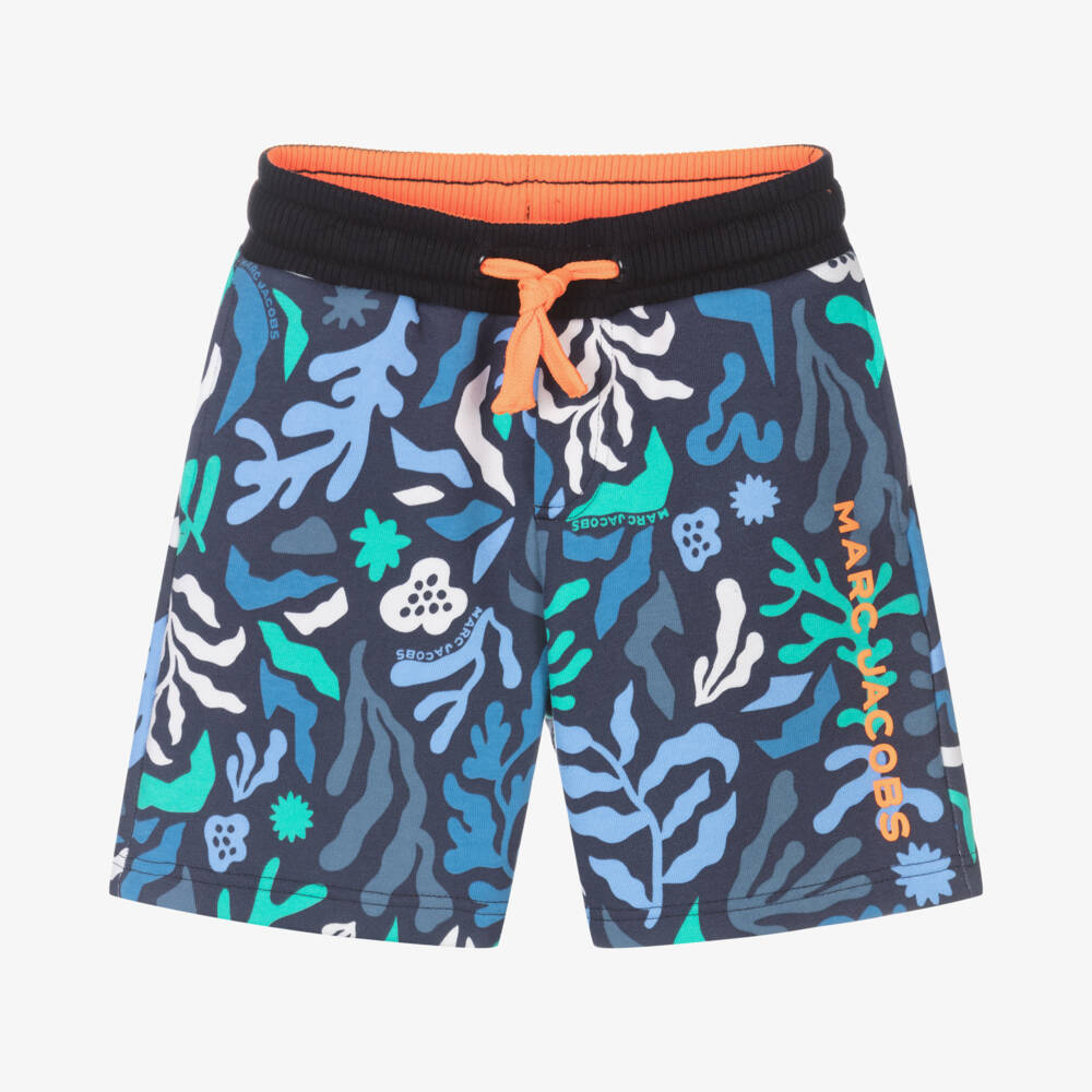 Navy blue shorts for boys by MARC JACOBS, made in soft, mid-weight cotton jersey. Patterned with a coral print in shades of blue, there is a neon orange puff ink logo on one leg for a bright and eye-catching designer statement. The useful drawstring waist is elasticated for comfort, with matching neon orange ties. The side seam and back patch pockets add a handy finishing touch to to these quirky shorts.