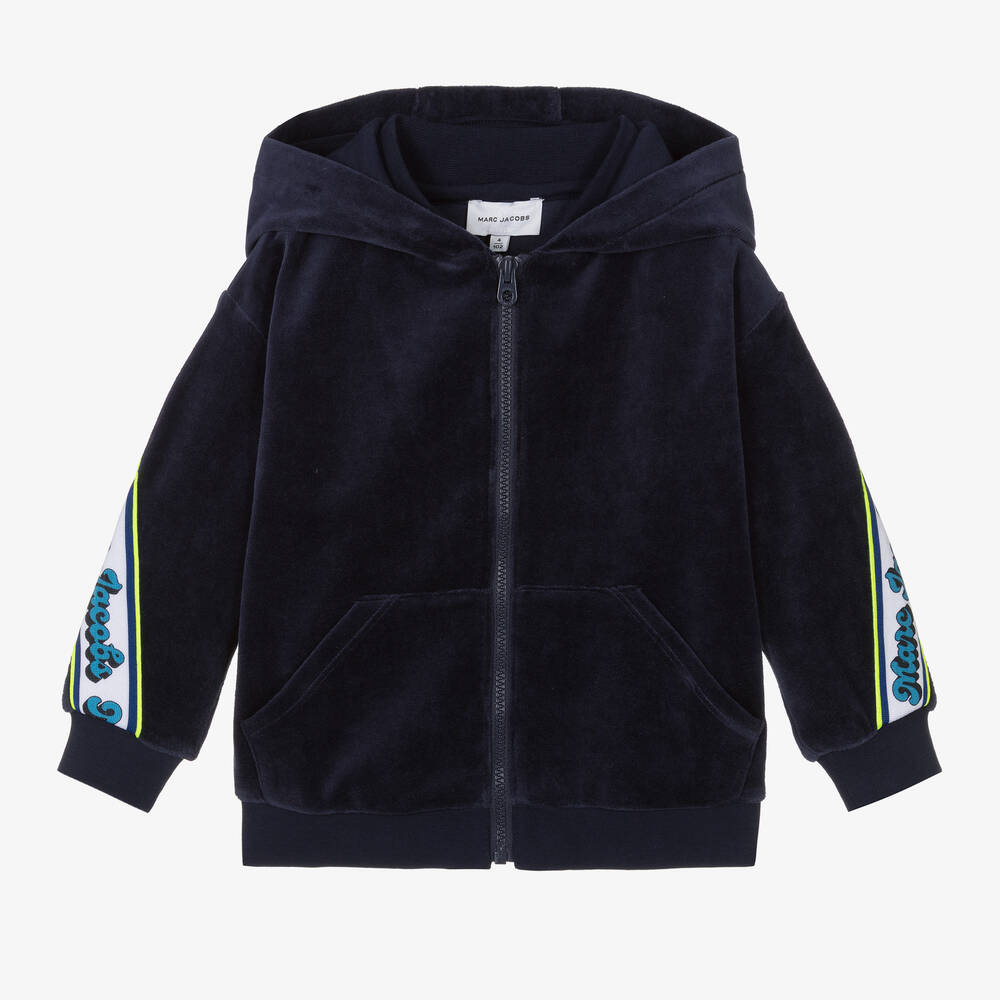Navy blue zip-up top for little boys by American designer MARC JACOBS, made in soft cotton velour. This comfortable hoodie has an eye-catching designer logo band across the back and down the sleeves in blue and white, outlined in neon yellow for a pop of colour. It has useful pouch pockets on the front and a branded zip fastener.