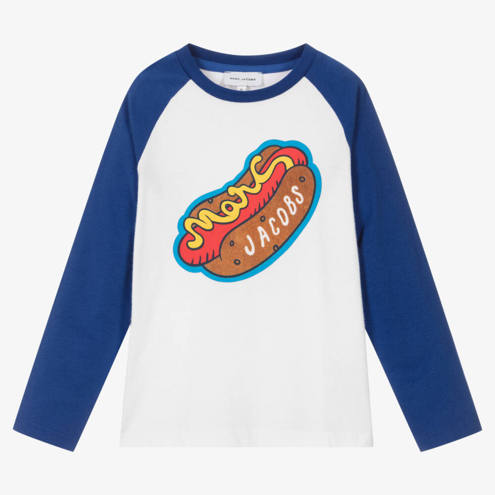 White with royal blue sleeves, this organic cotton top for boys is by MARC JACOBS. It features a felted hot dog motif on the front, incorporating the designer's name for a signature look. Great for everyday wear, it is made in soft and comfy jersey.