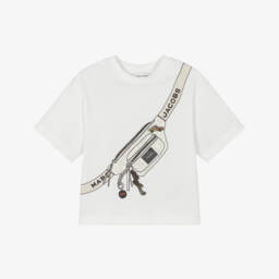 Off-white relaxed-fit T-shirt for boys by MARC JACOBS, made in soft cotton jersey. Casual and comfortable, it features a playful trompe l'oeil graphic on the front, depicting a jumbled logo belt bag with a branded strap.